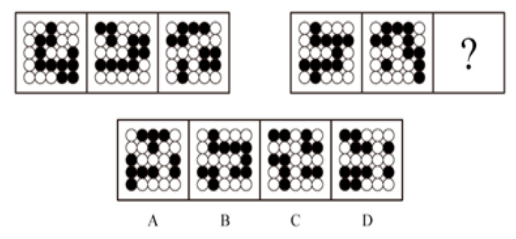【答案】A。中公中公解析:题干图形的黑圆有明显连在一起的,考虑数部分数。第一组图黑圆连起来看,部分数分别为1,2,3;第二组图应符合此规律,黑圆连起来看部分数依次为1、2、3,故此题选A。