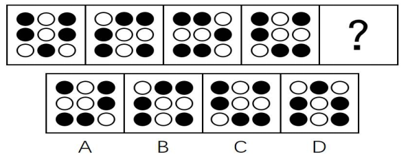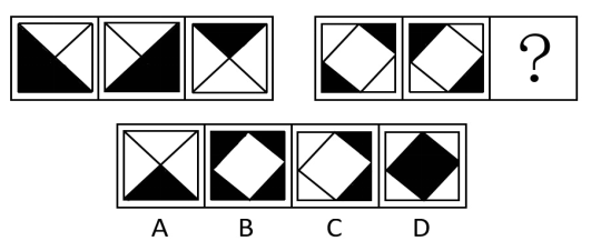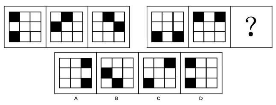 【答案】D。中公中公解析:元素组成相似,优先考虑组合叠加。第一组图形中,前两个图黑白叠加形成第三个图,叠加时遵循以下规则:黑+白=白,黑+黑=白,白+黑=白,白+白=黑。依此规律此题选D。