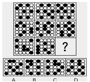 【答案】C。第一行图形的小黑点都不连接,第二行的小黑点有两个连着,第三行的小黑点有三个连着的,如下图所示,问号处应该有3个小黑点挨着,对应B,C项, 题干每一行的黑点数量都为7、8、9,问号处应为9个小黑点,B项为8个小黑点,排除。故此题选C。
