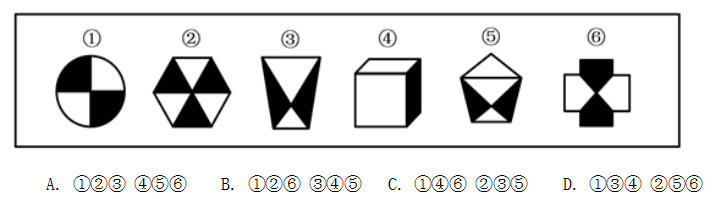 【答案】B。中公解析1:本题每幅图中都由黑白两部分组成,观察发现图①②⑥中白色部分和黑色部分的面积都是相同的,而图③④⑤中白色部分的面积都大于黑色部分的面积,故图①②⑥为一组,图③④⑤为一组。故正确答案为B。