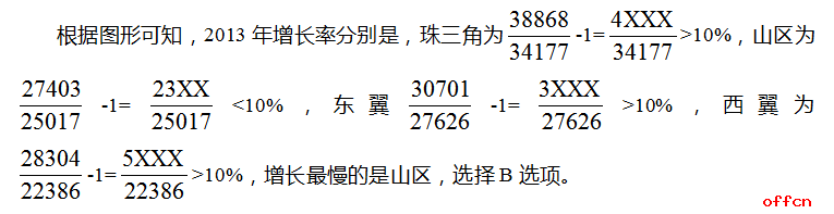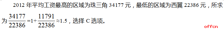 中公解析:根据图形材料可知,2013年我省城镇私营单位就业人员平均工资为37020元,2012年为31920元,所求为37020-31920=5100元,选择A选项。